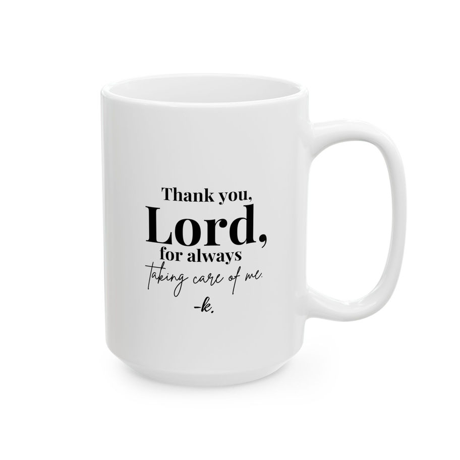 A ceramic mug with a glossy finish, featuring a heartfelt message 'Thank you Lord for always taking care of me.' This mug is perfect for daily use or as a gift to someone who values faith and gratitude. Suitable for both 11oz and 15oz sizes, microwave and dishwasher safe.